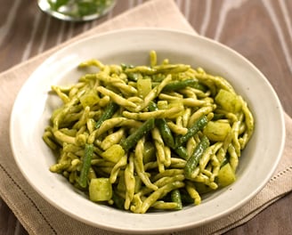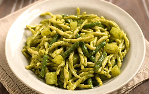 In una larga ciotola, mescolare le trofie con una generosa quantità di pesto di basilico, diluendo se necessario con un po' di acqua di cottura della pasta.