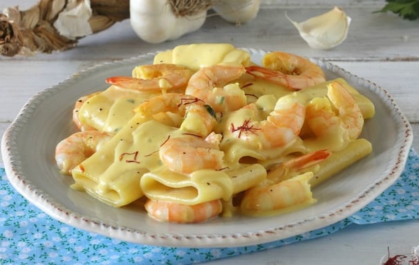 Scolate la pasta e trasferitela nella padella con la salsa di gamberi e zafferano. Mescolate bene per far amalgamare i sapori.