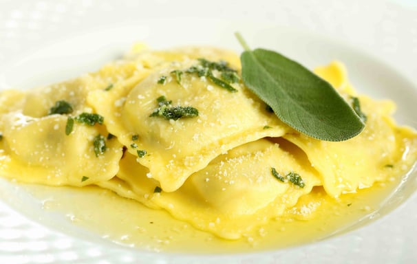 Disporre i ravioli su piatti individuali, guarnendo con ulteriori foglie di salvia croccanti sulla sommità.